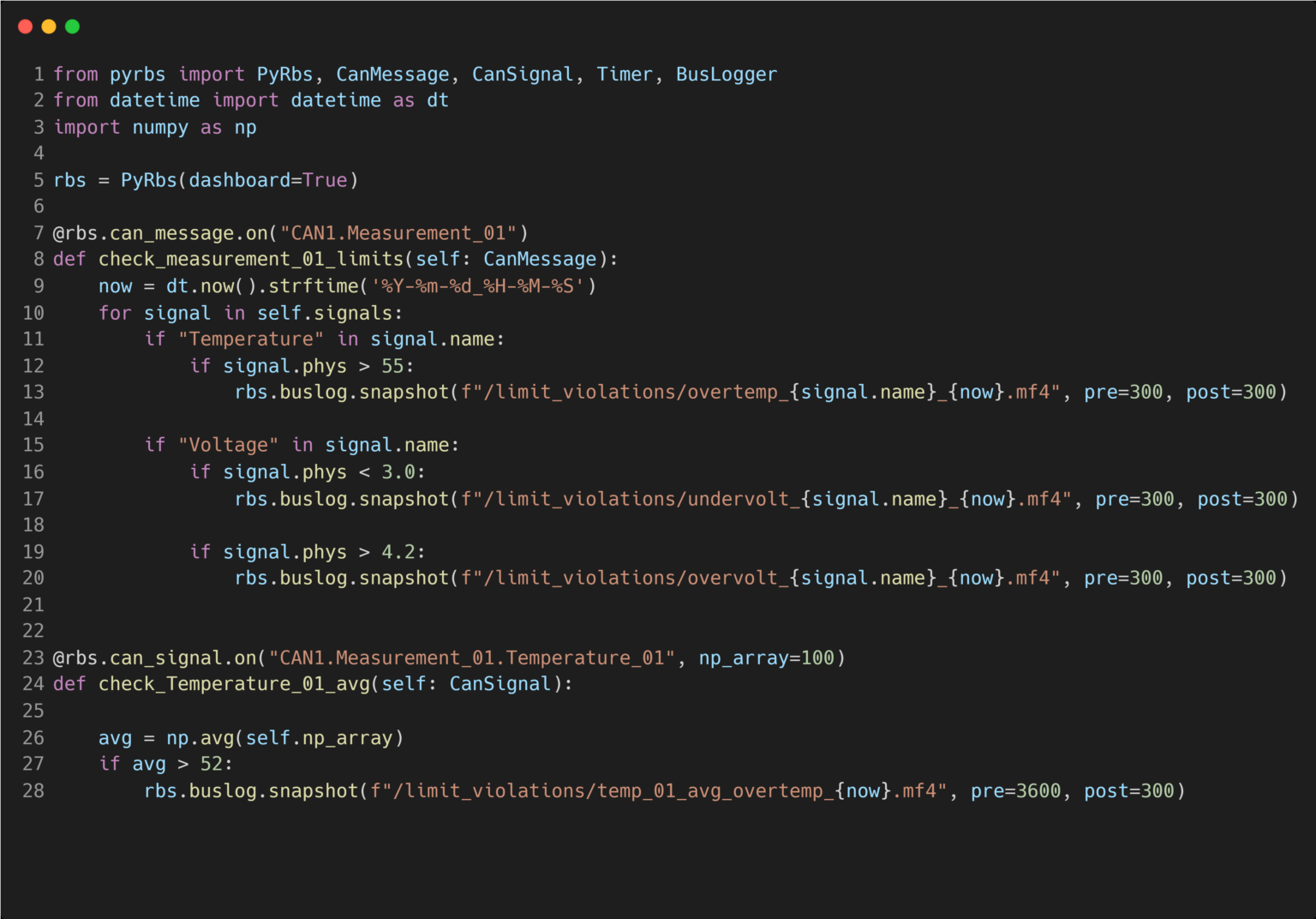 Besides the classic start and stop log file creation, you can create a snapshot. Here you configure a pre and post trigger time in seconds and place it in the restbus code.