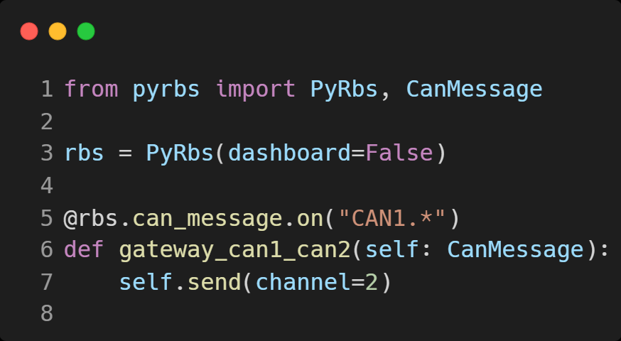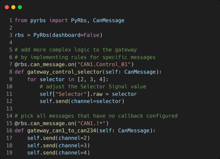 Gateway With only a short amount of code a gateway functionality can be achieved. If some more logic will be needed, thanks to the PyRbs Python class it can be realised with minimal effort. Explore on GitHub Implement individual rules for specific CAN Messages and access all CAN Messages that don´t have a individual programming