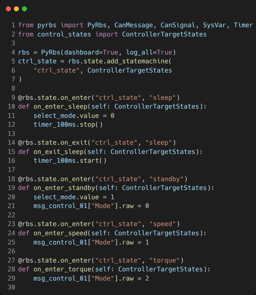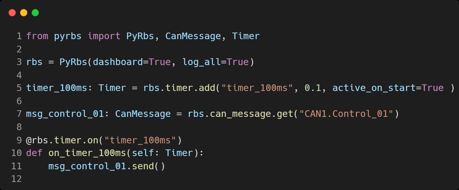 the PyRbs python Class is where all the magic happens with it you control Timers, CAN Messages and Signals allong with Statemachines and System Variables react on changes or updates in state or values